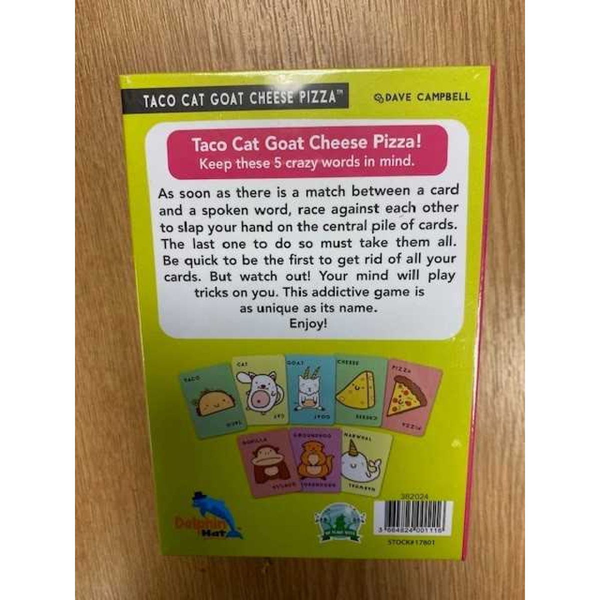 Taco Cat Goat Cheese Pizza! Keep these five crazy words in mind. As soon as there is a match between a card and a spoken word, race against each other to slap your hand on the central pile of cards. The last one to do so must take them all. Be quick to be the first to get rid of all of your cards. Look out for the special action cards – the gorilla, narwhal and groundhog, which require players to make specific gestures before racing to slap the deck.