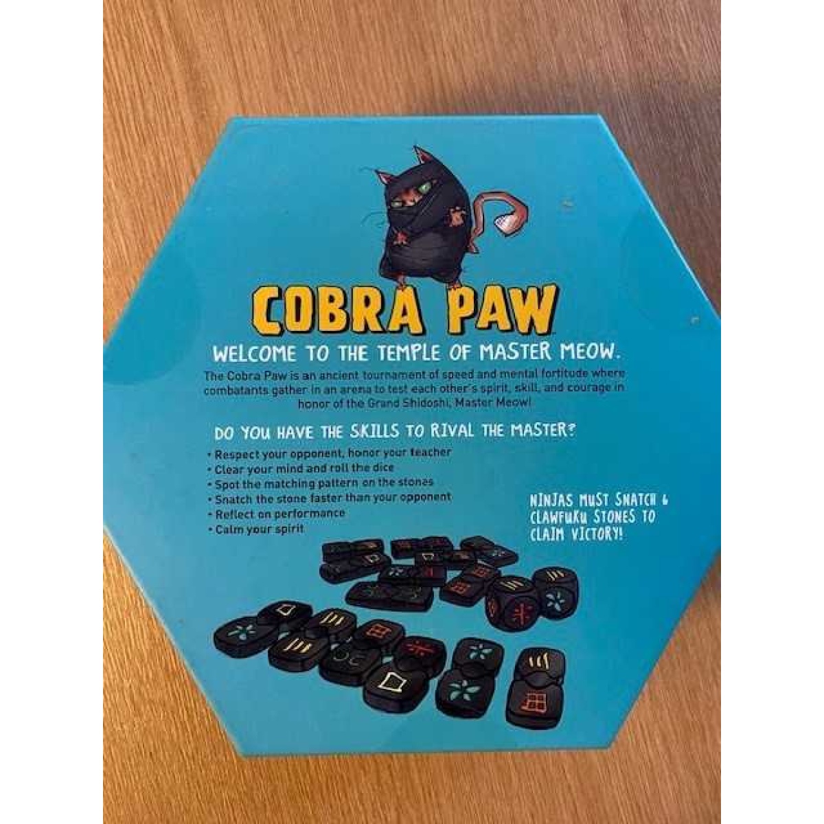 Cobra Paw is a fast-paced, 2-6 player dexterity and cognitive game (ages 6+) where players act as ninjas racing to spot and grab matching pattern tiles based on dice rolls.