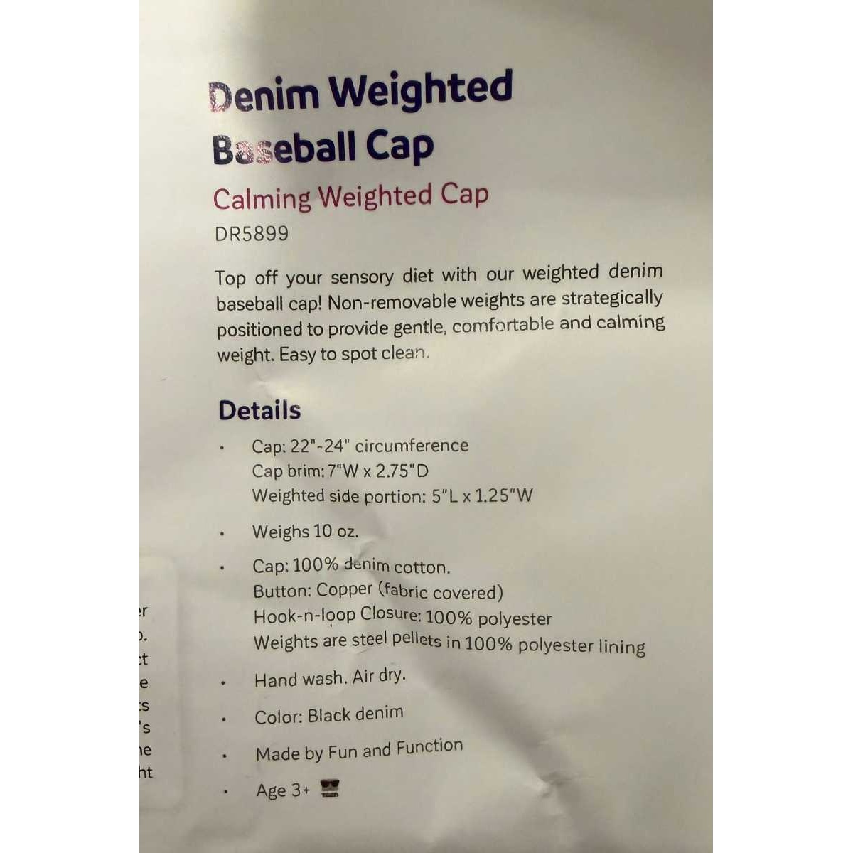 -The denim cap has 270 grams of weight that when fitted to the head can have a calming influence.