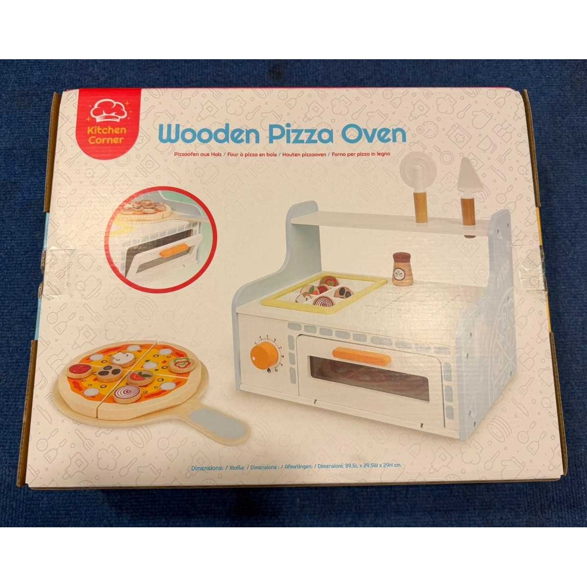 Contents: 1x Kitchen Corner Wooden Pizza Oven; 4x Pizza Slices; 1x Pizza Board; 1x Pizza Wheel; 1x Pizza Slicer; 1x Seasoning Jar; 2x Pepperoni Toppings; 2x Tomato Toppings; 2x Mushroom Toppings; 2x Onion Toppings; 2x Olive Toppings; 2x Pepper Toppings