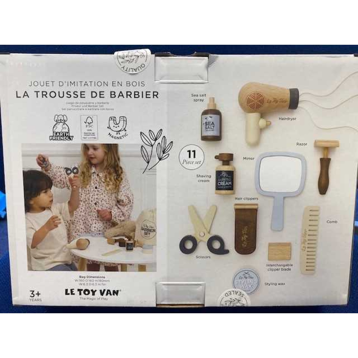 With this charming wooden barber set there is everything you need to style gents hair and beards - comb, scissors, hair clippers (with 2 interchangeable magnetic blades), shaving cream, hair dryer, razor, sea salt spray, mirror and styling wax. Then when finished, check out the perfect result in the included mirror.